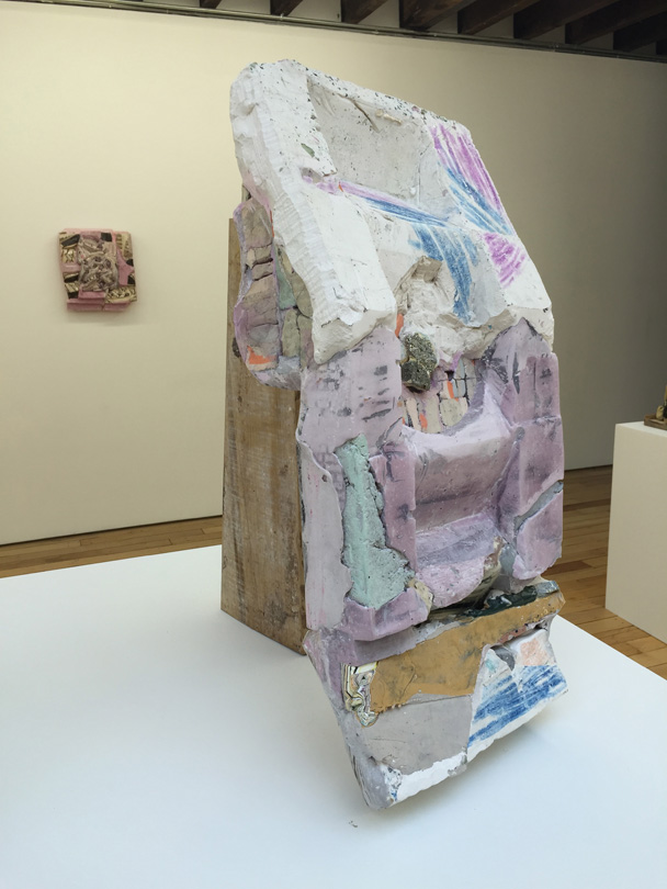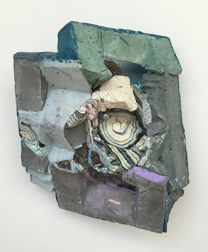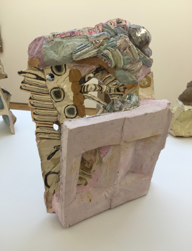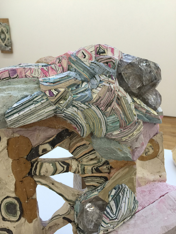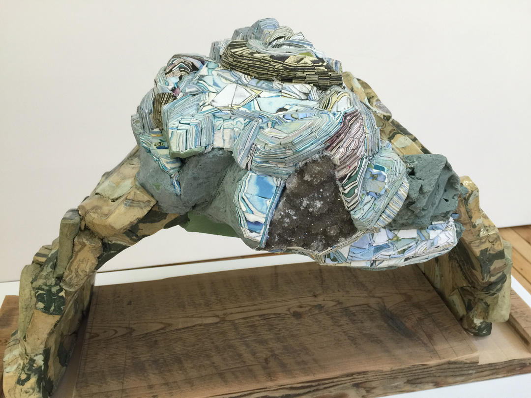 #27, 2015, ceramic, hydrostone, pigment, paper, crushed glass, druzy quartz, steel, 22″ x 19″ x 16″