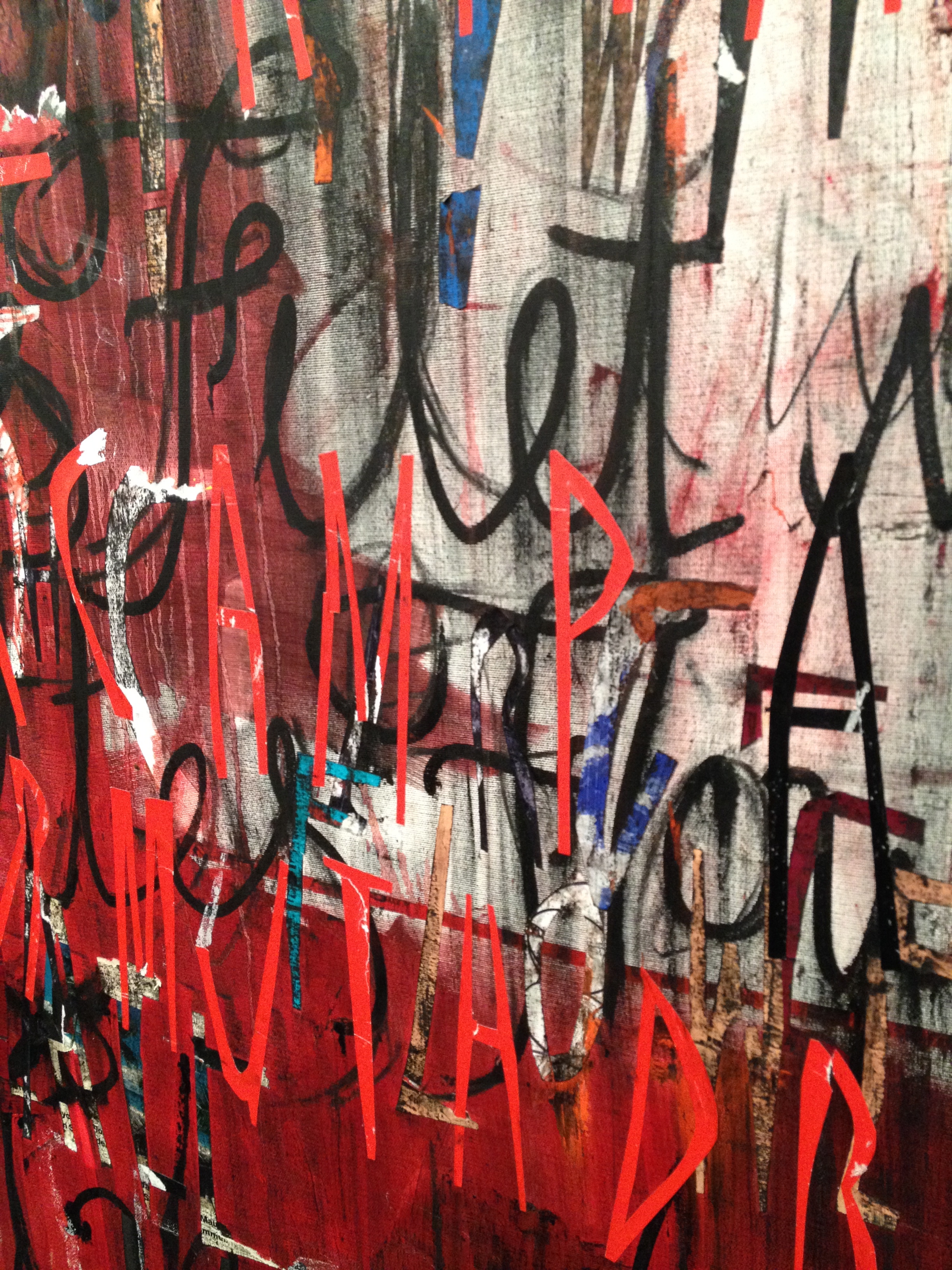 oil, spray paint, marker, oil crayon, charcoal, pastel chalk, collage on canvas