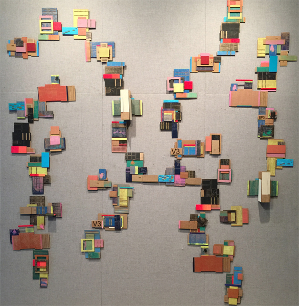 Great work lingers, and the works that were a part of between a place and candy: new works in pattern + repetition + motif, organized by Norte Maar and curated by Jason Andrews at the 1285 Avenue of the Americas Gallery, were no exception. They lingered. And they are still lingering 4 months later. The exhibition ran in New York from March 16 – June 12, 2015, and I had the great pleasure of seeing it in June before it closed. I had meant to write about the work right away but life got in the way and this post kept being put off, but the lingering power of the work haunted me. I am still struck, months later, by how immediate the work is, even in the photographs. The works still have a confident, visceral impact; Look at me and remember.